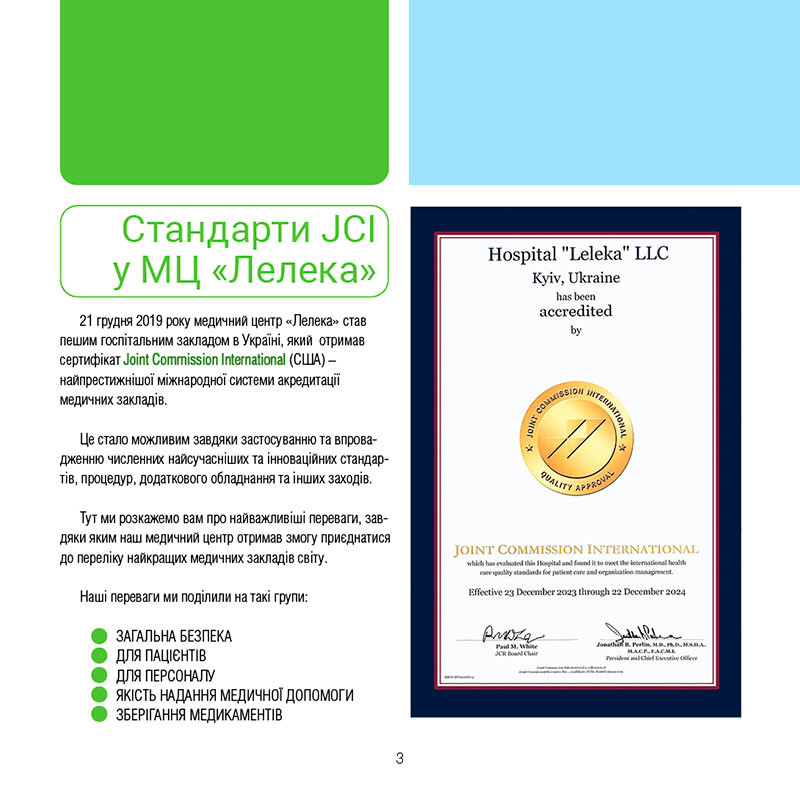 21 грудня 2019 року медичний центр «Лелека» став першим госпітальним закладом в Україні, який отримав сертифікат Joint Commission International (США) – найпрестижнішої міжнародної системи акредитації медичних закладів.